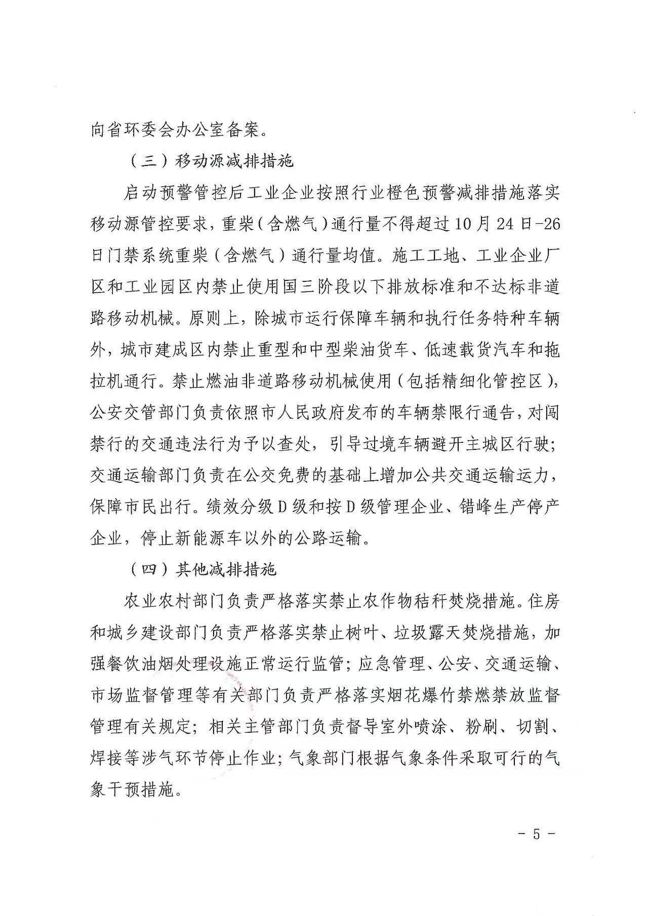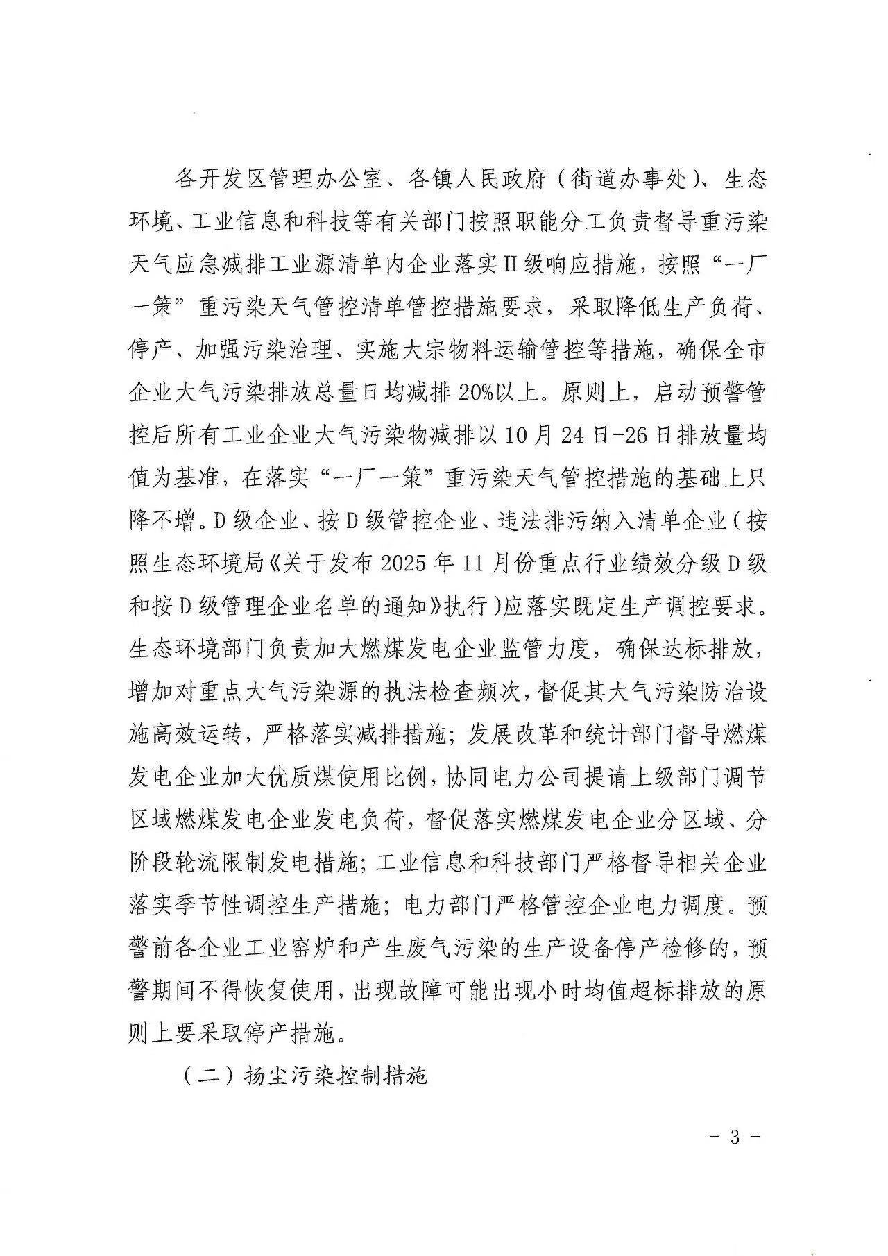 启动预警管控后,工业企业大气污染物减排和重柴(含燃气)通行以10月24日-26日排放(通行)量均值为基准。D级企业、按D级管控企业、违法排污纳入清单企业(按照生态环境局《关于发布2025年11月份重点行业绩效分级D级和按D级管理企业名单的通知》执行),落实既定生产调控要求。